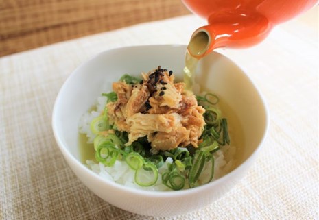 Ochazuke : Simply place some green onions and a suitable amount of grilled mackerel flakes on rice and pour tea over it. The broth that has been soaked into the mackerel will dissolve into the tea, so no seasoning is needed. It has a slight salty taste and is very easy to eat. We also recommend sprinkling some black sesame seeds or chopped nori seaweed on top, if you like.